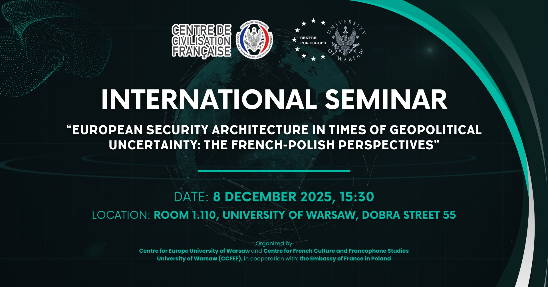 The Centre for Europe of the University of Warsaw and the Centre for French Culture and Francophone Studies of the University of Warsaw invite you to the International Seminar “European security architecture in times of geopolitical uncertainty: the French-Polish perspectives”